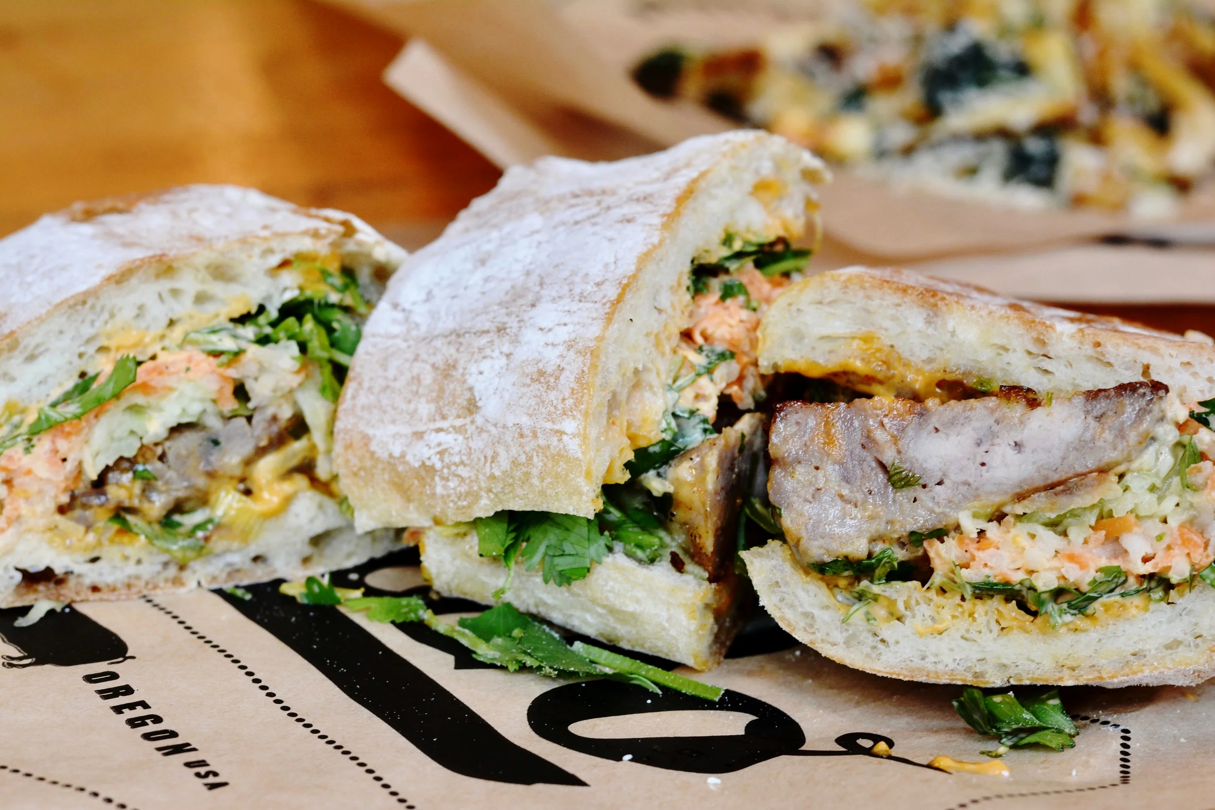 Pork Meatball Bahn Mi sandwiches with herbed fries and local beer
